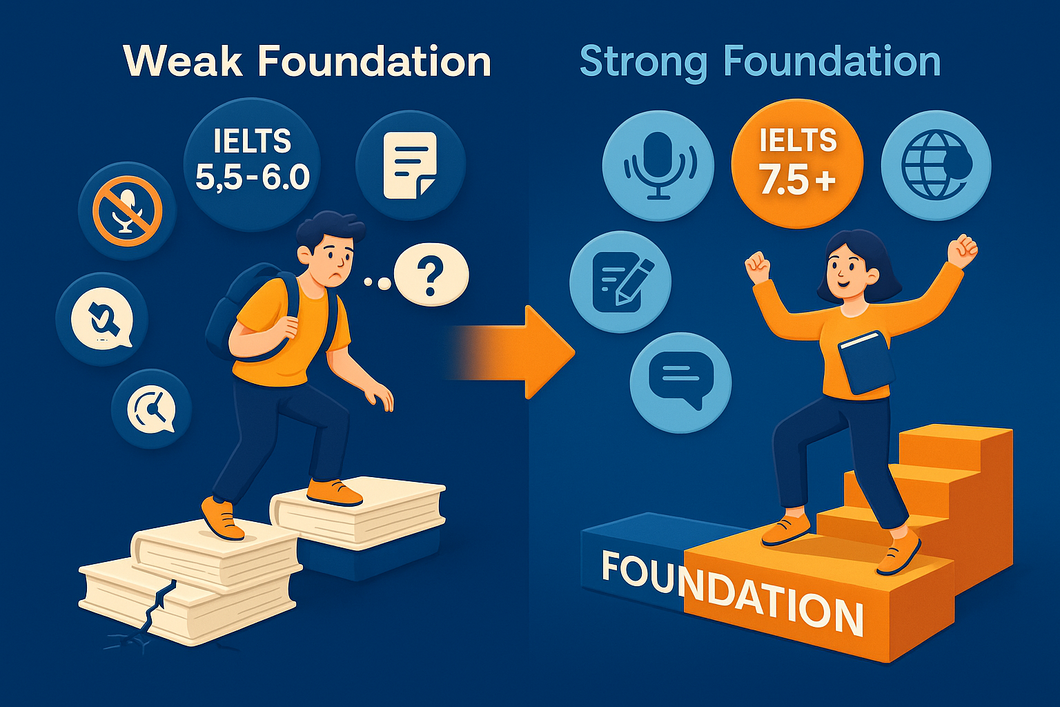 Một nền tảng yếu sẽ là rào cản lớn khi học lên cao. Nhiều học viên luyện IELTS nhiều năm nhưng chỉ dừng lại ở band 5.5–6.0 do: